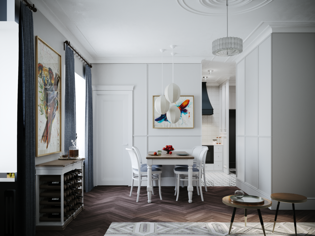 Salon urządzony jest z dbałością o detale, z miękkimi sofami i fotelami, otoczonymi delikatnymi tkaninami szenilowymi z elementami włoskiej skóry. Centralnym punktem jest kominek z kamienia naturalnego, który dodaje wnętrzu ciepła i przytulności. Duże okna otwierają widoki na otaczającą przyrodę, zapraszając naturę do wnętrza.