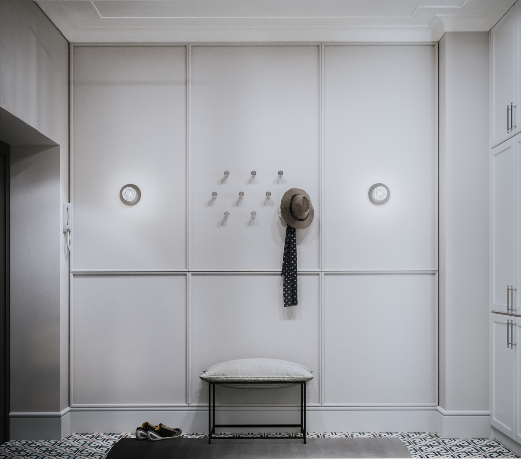 Po przekroczeniu progu znajduje się przestronny hol, gdzie naturalne światło wpada przez duże przeszklenia, odbijając się od półmatowych podłóg drewnianych oraz ceramicznych mozaik.