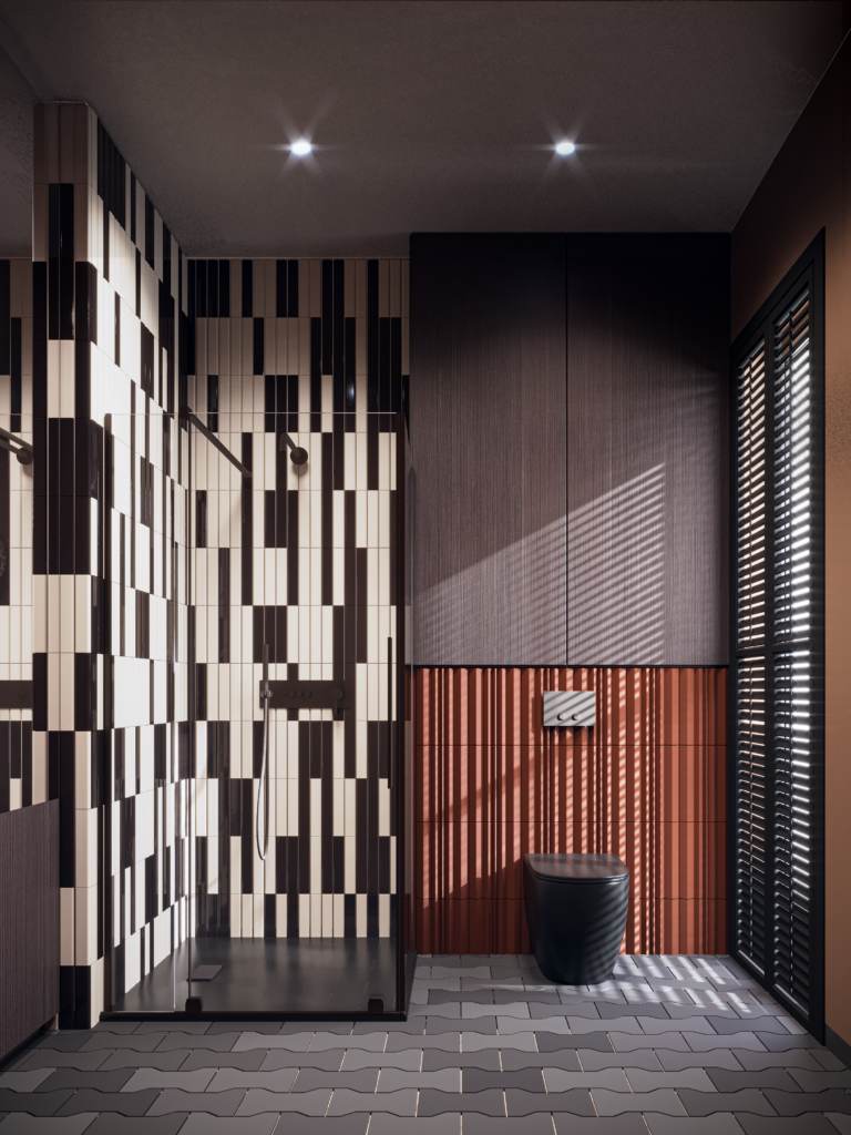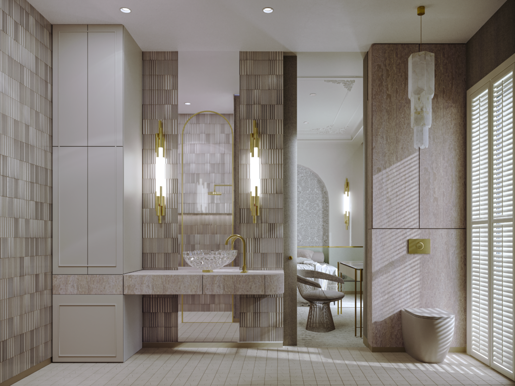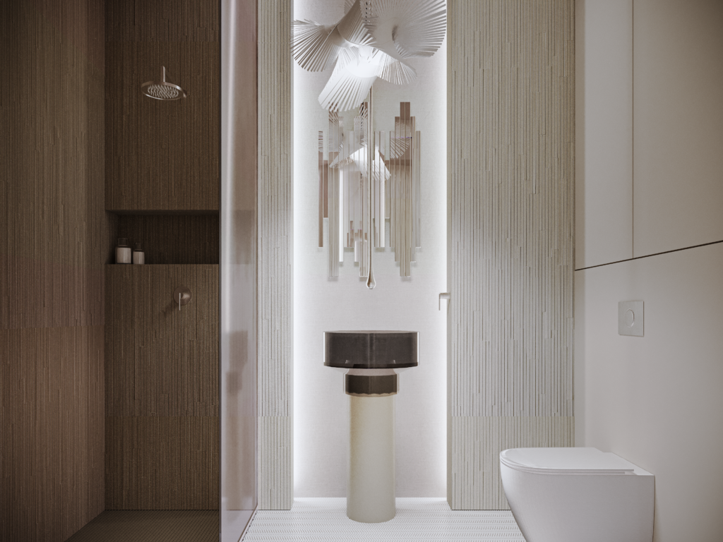 Łazienki są urządzone w minimalistycznym stylu, z szafkami pokrytymi rzadkimi fornirami, a ściany i podłogi zdobią głownie włoskie ceramiki – dodając charakteru i elegancji.