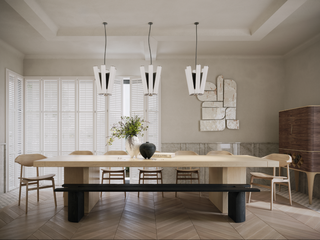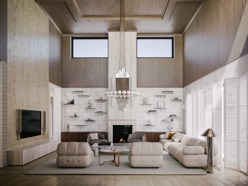 Salon urządzony jest z dbałością o detale, z miękkimi sofami i fotelami, otoczonymi delikatnymi tkaninami szenilowymi z elementami włoskiej skóry. Centralnym punktem jest kominek z kamienia naturalnego, który dodaje wnętrzu ciepła i przytulności. Duże okna otwierają widoki na otaczającą przyrodę, zapraszając naturę do wnętrza.