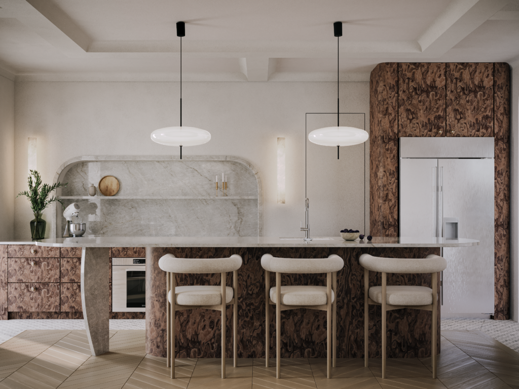 użyte materiały: kwarcyt Patagonia, fornir orzechowy, onyks jadeitowy, skóra nappa, szenil, czeczot bielony