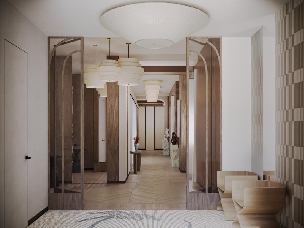 Bezpośrednio połączony z holem korytarz prowadzący do części prywatnej właścicieli zaaranżowany jest jako galeria sztuki z postumentami oraz ścianami wyłożonymi różnymi gatunkami kamienia naturalnego.